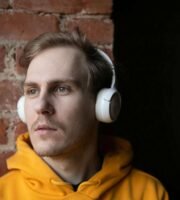 Three modern, oval-shaped, modular white houses are situated in a lush, green hilly landscape. Each house has large glass windows and wooden staircases leading up to their entrances. A beige canopy tent is set up in the grassy area in front of the houses, and a person is seen walking near the structure. The sun casts warm light, enhancing the scenic and serene atmosphere.